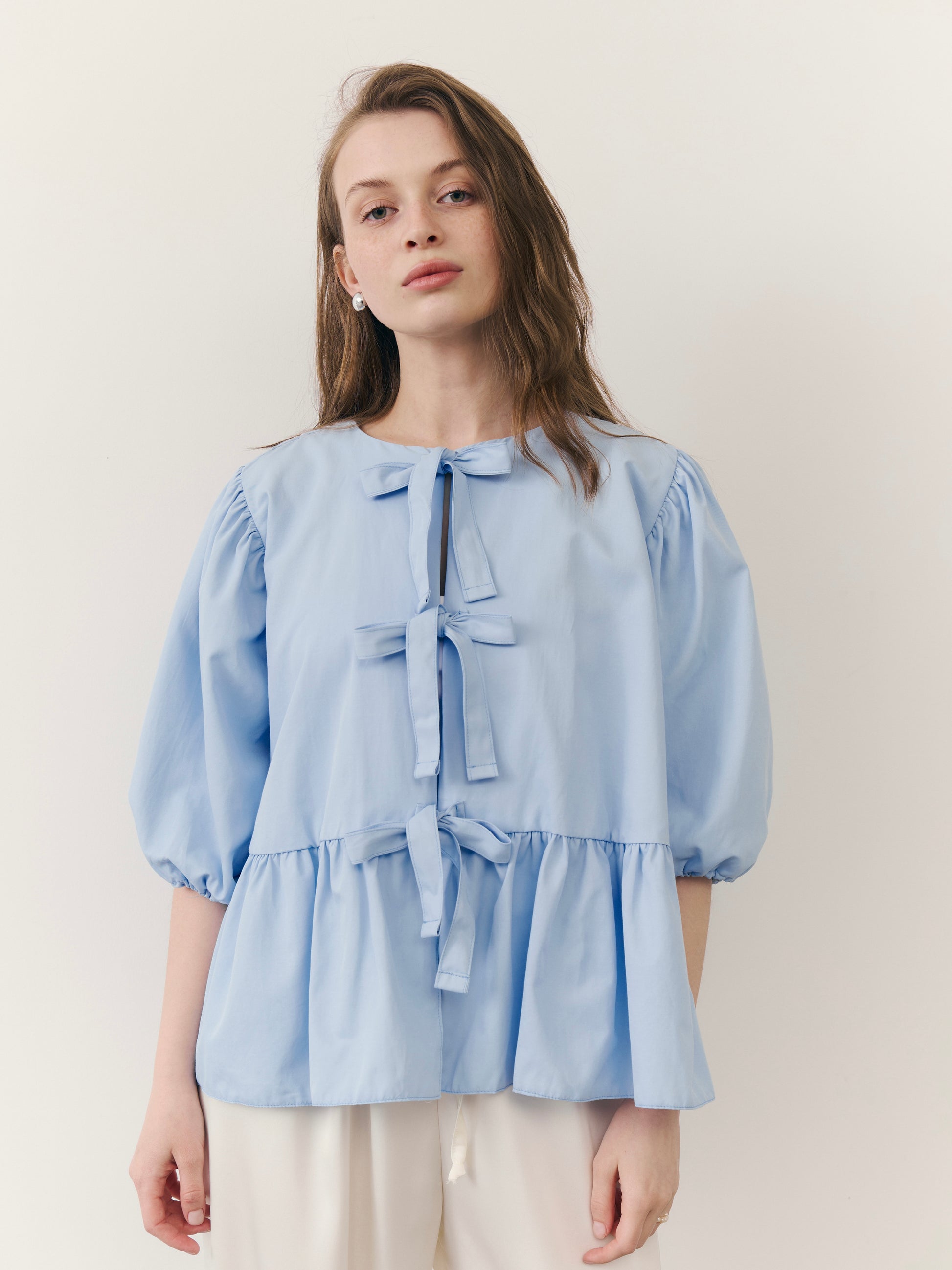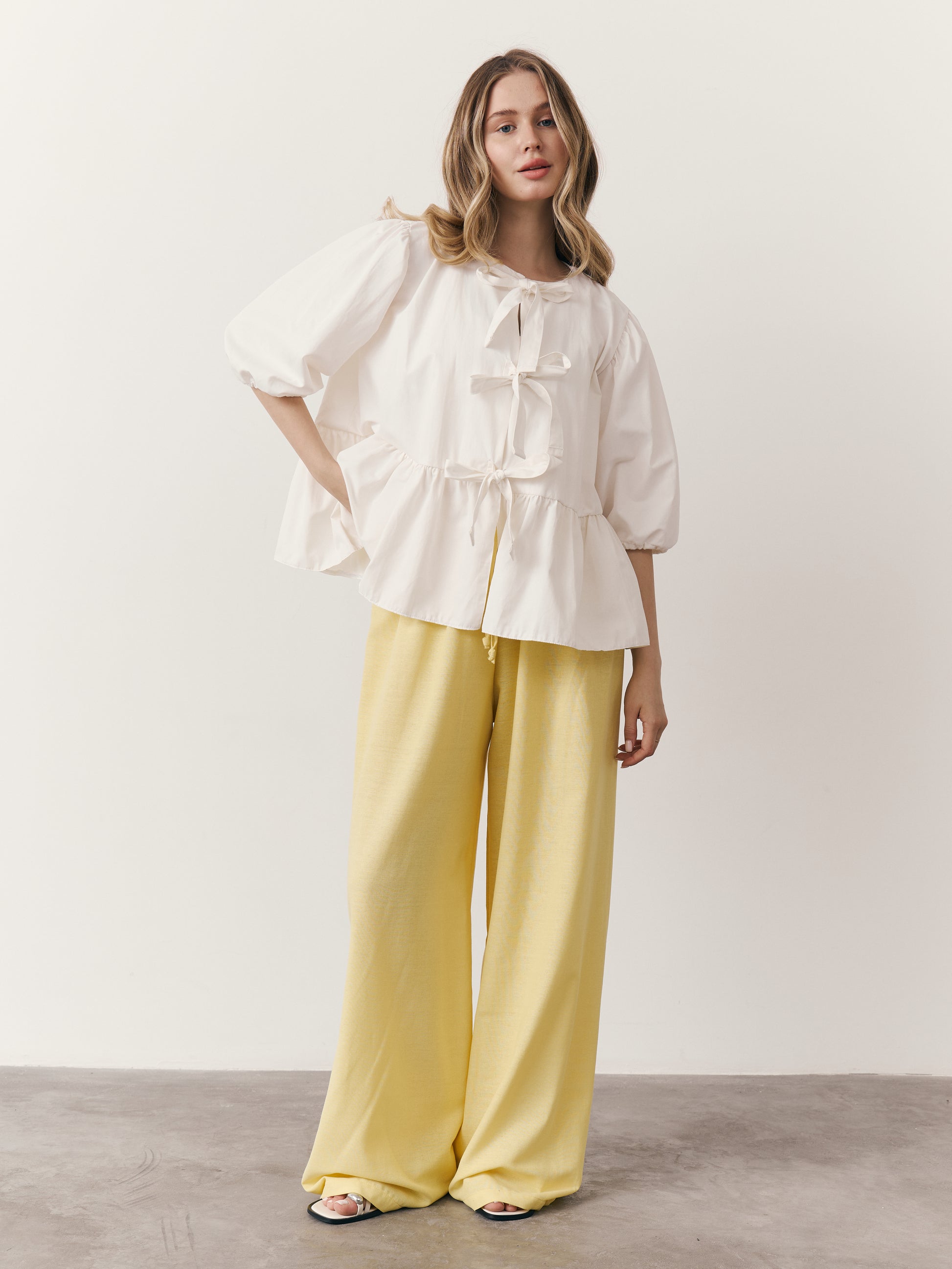 Блуза на завʼязках, три бантики спереду. Вільного крою та з  коротким  рукавом на резинці.