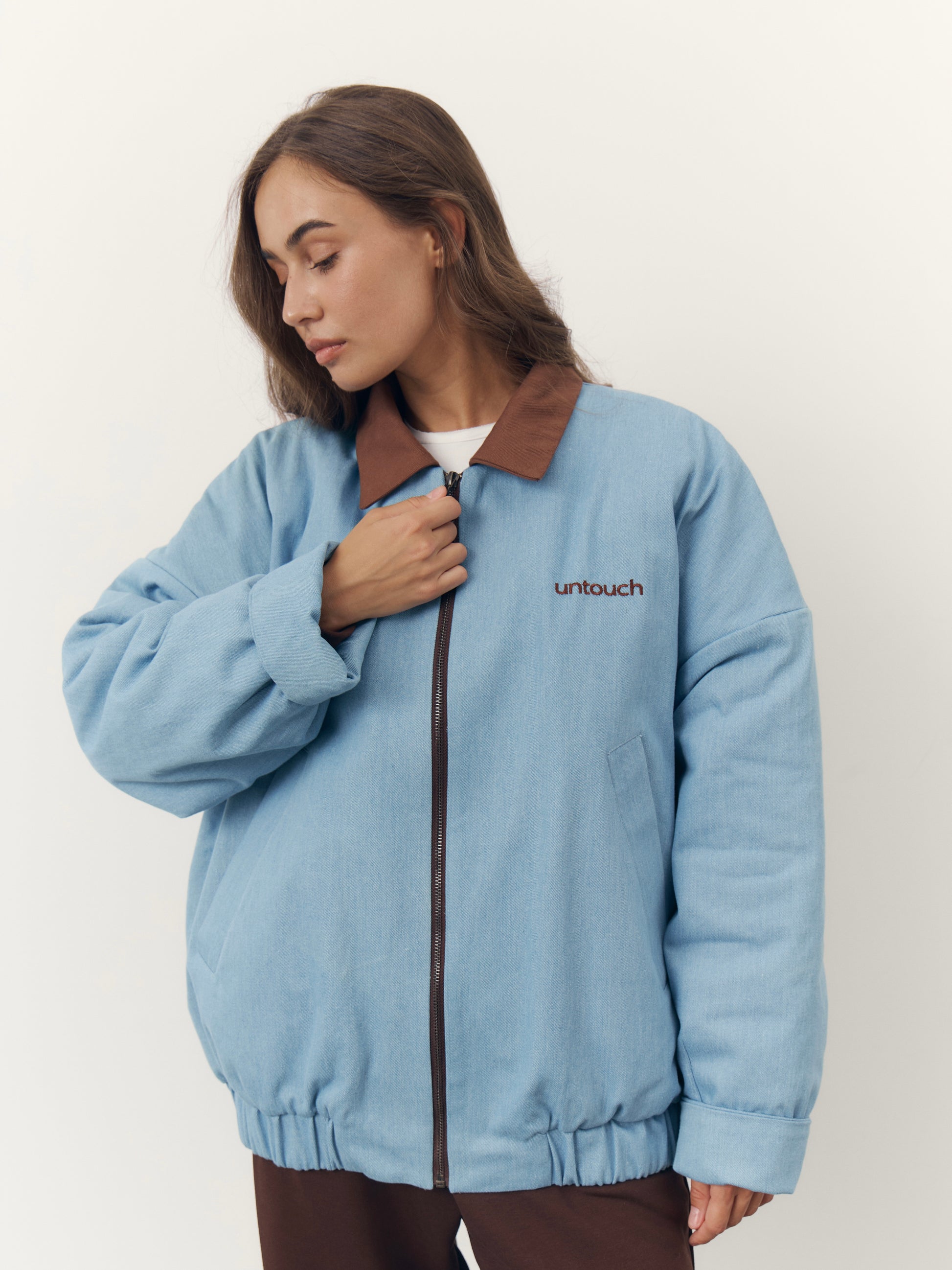 Джинсовий бомбер з контрастним коміром, вмісткими кишенями, резинкою знизу та вишивкою untouch.