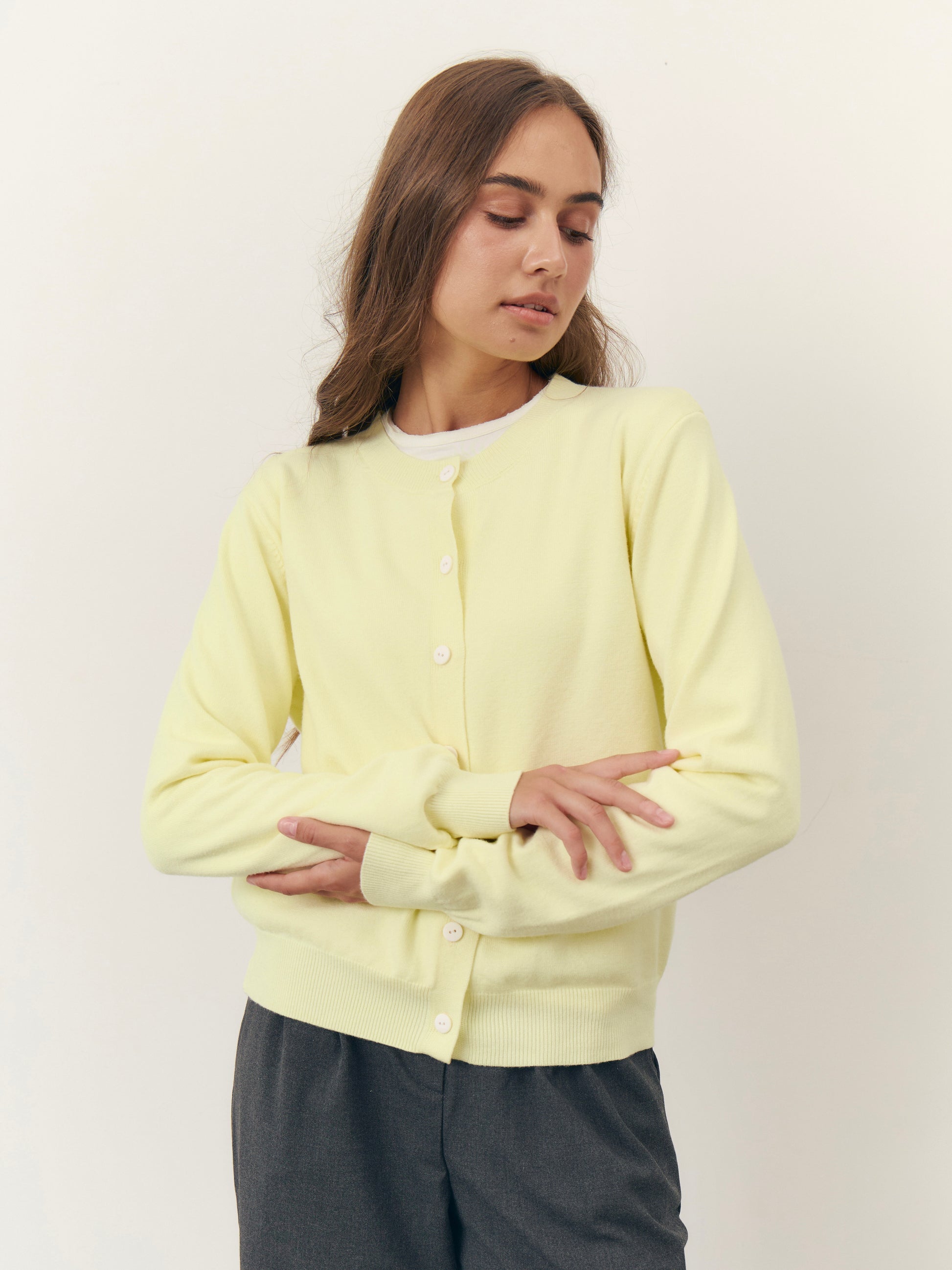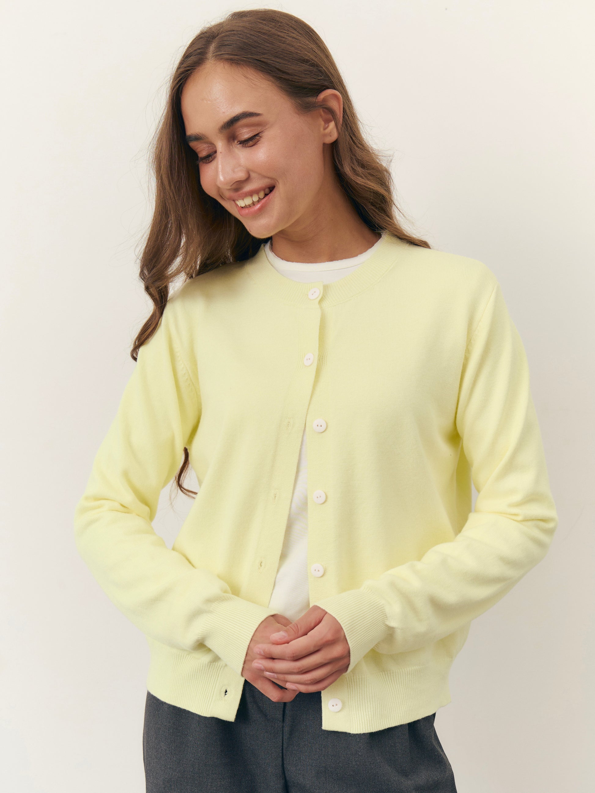 Трикотажний кардиган з круглою горловиною, довгими рукавами. Застібається на ґудзики. Легкий, м’який та приємний до тіла.