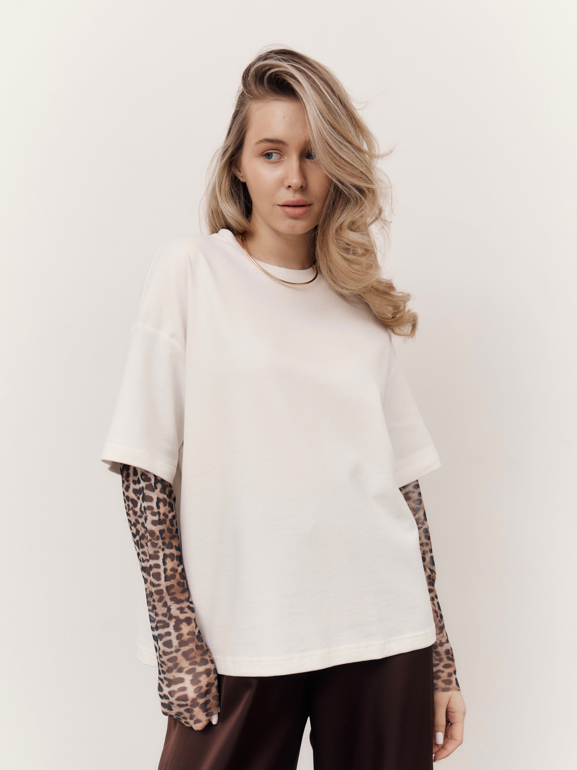 Виконаний із щільної бавовни з легким велюр ефектом, що додає приємної текстури. Рукава – з напівпрозорої леопардової сітки. Спущена лінія плеча та еластична резинка на горловині.