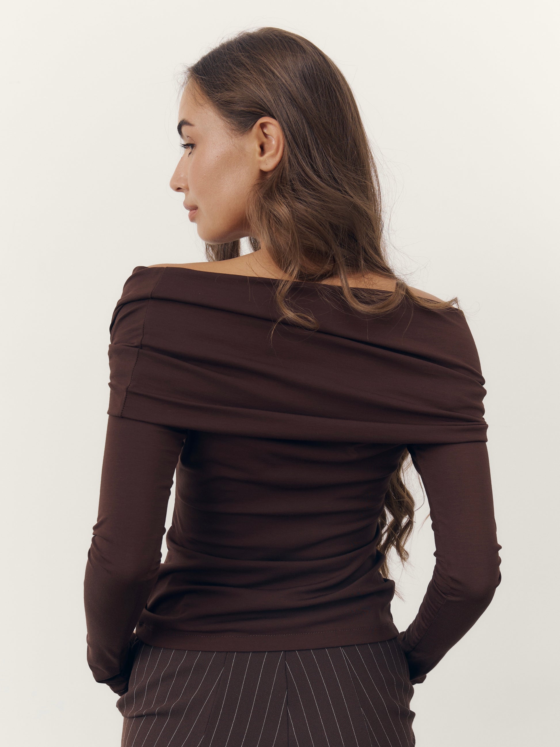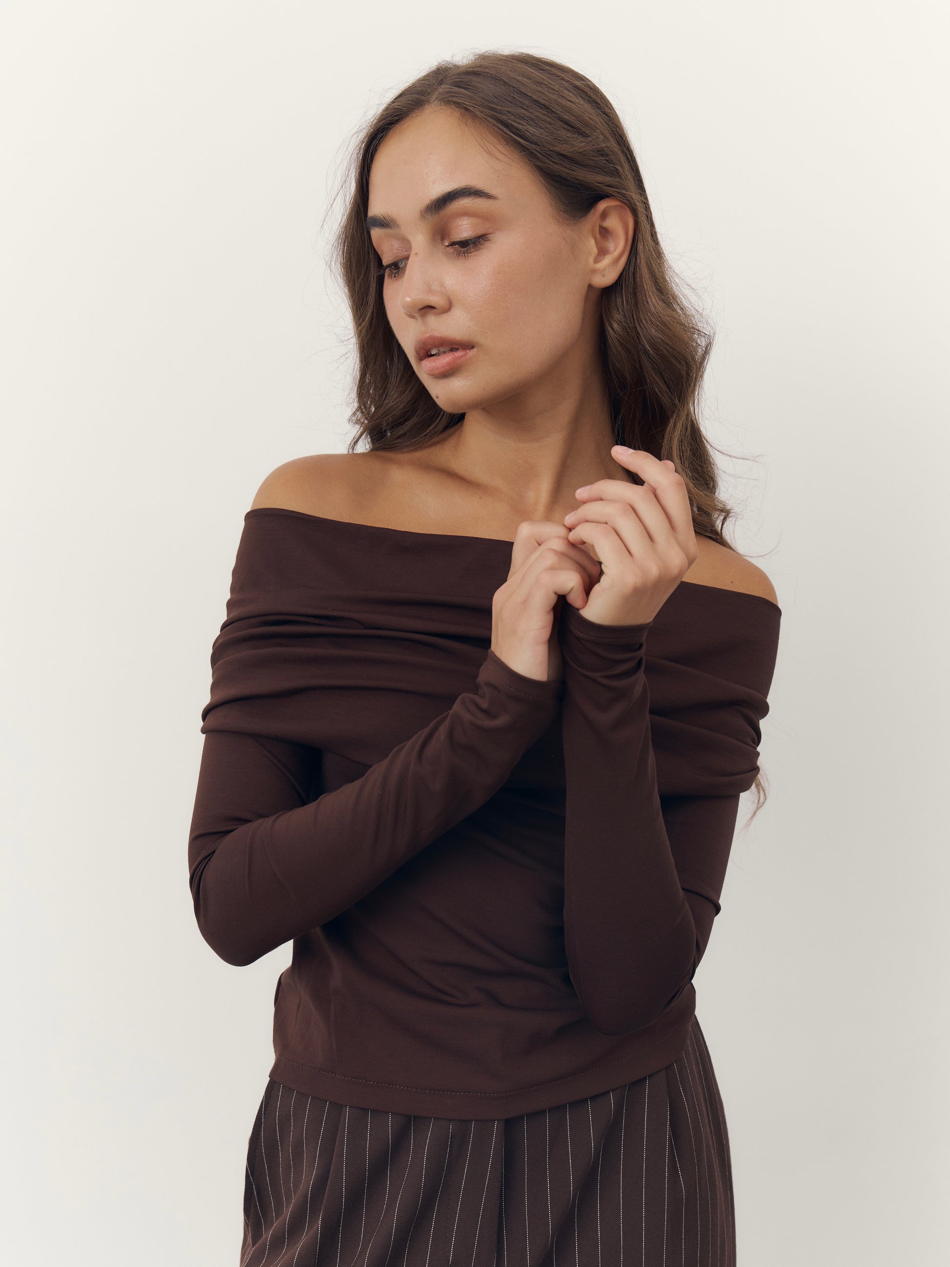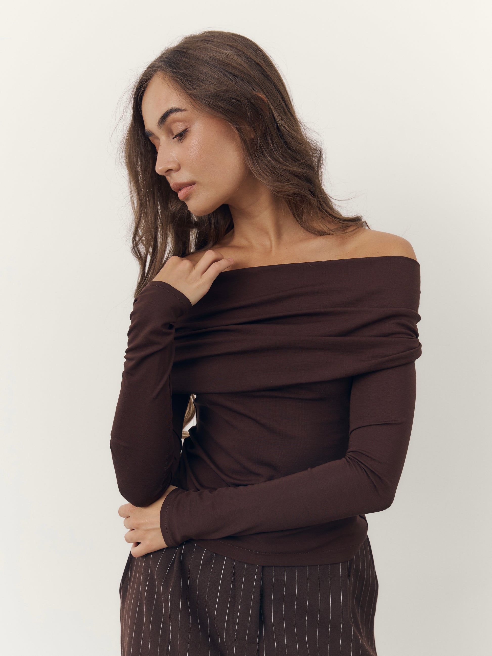 Лонгслів із відкритими плечима приталеного силуету. Тканина еластична та приємна до тіла