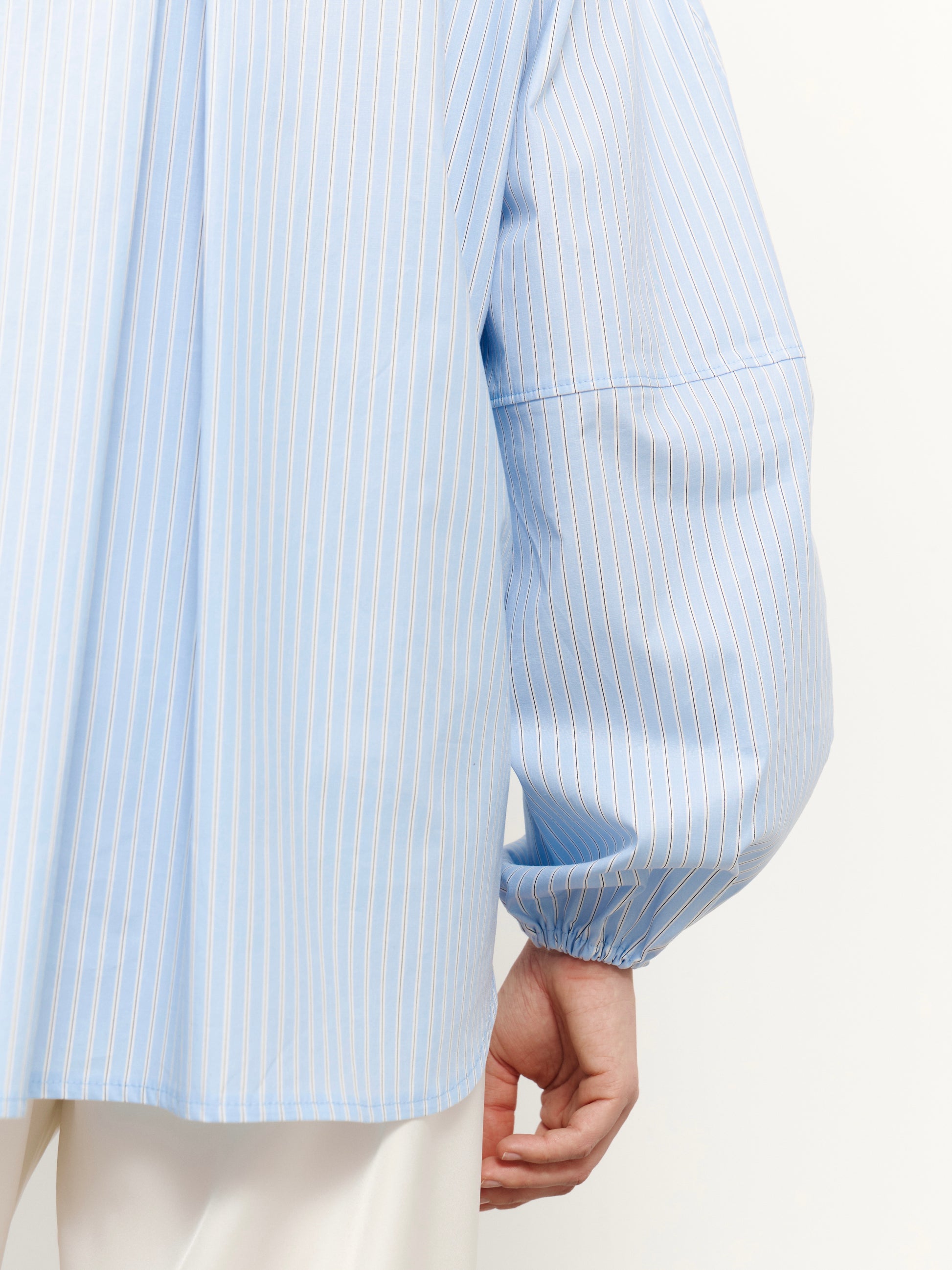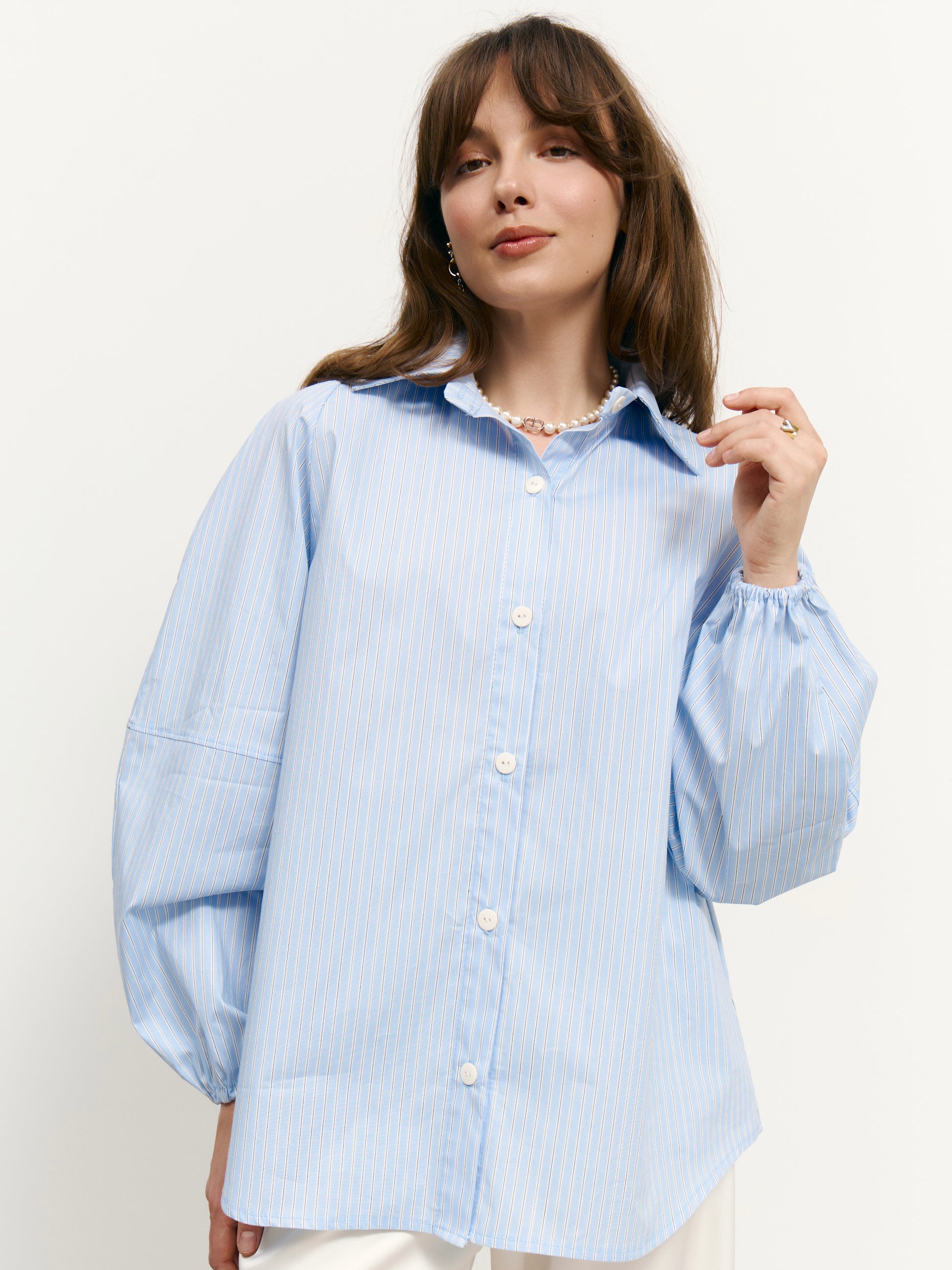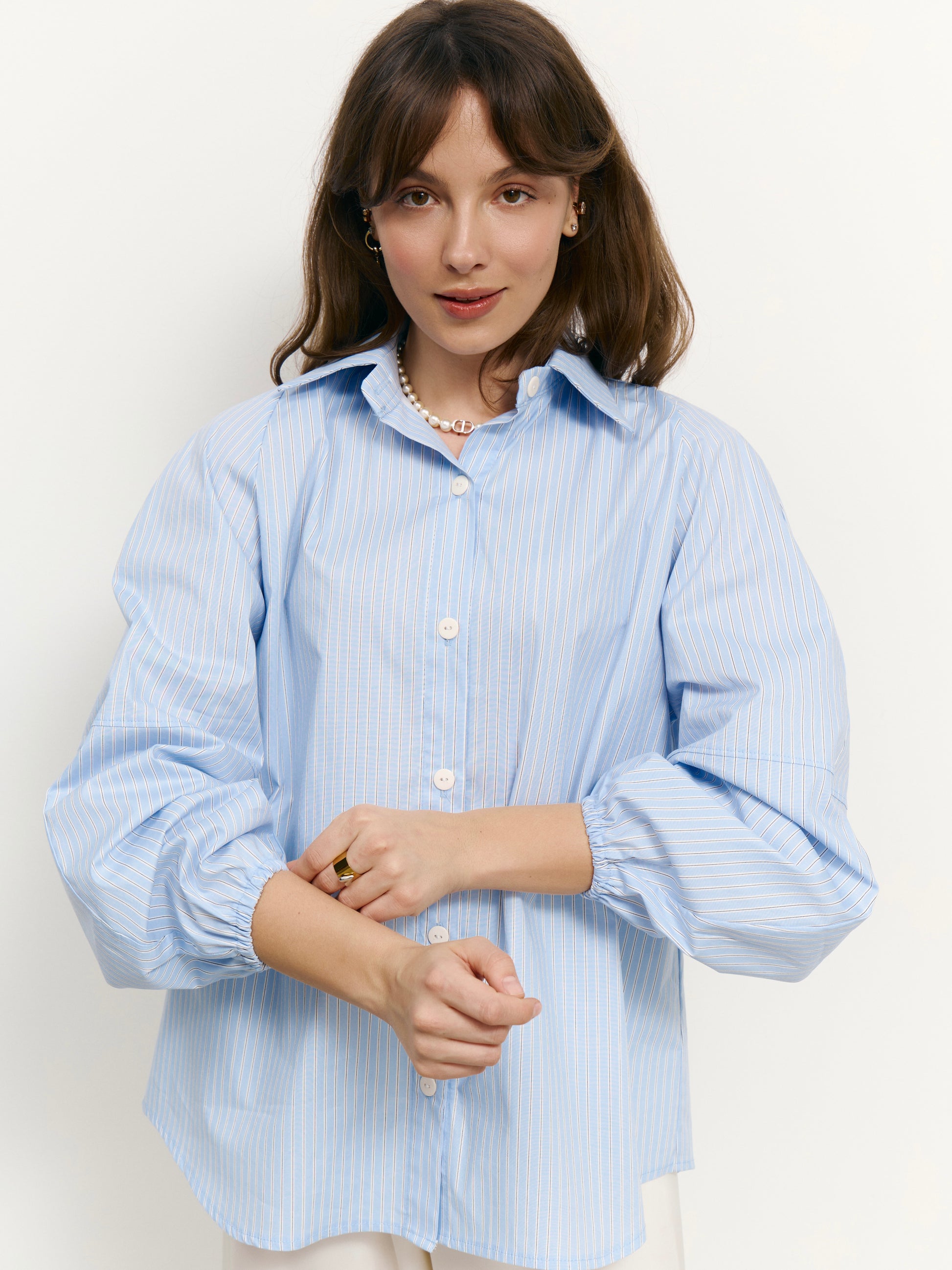 Сорочка вільного крою з м’якої бавовняної тканини в делікатну смужку. Спущене плече, об’ємні рукави з резинкою та акуратний комір