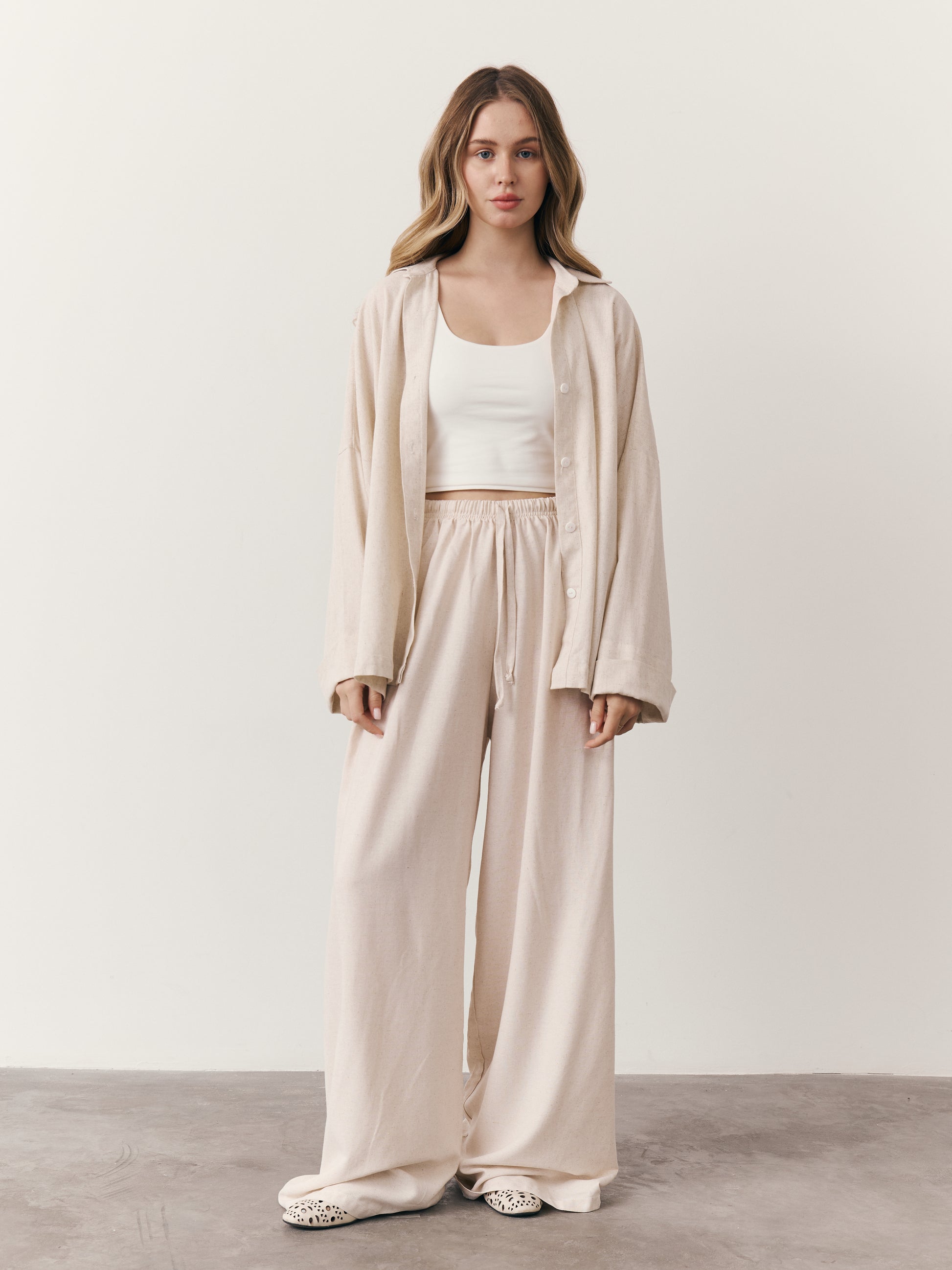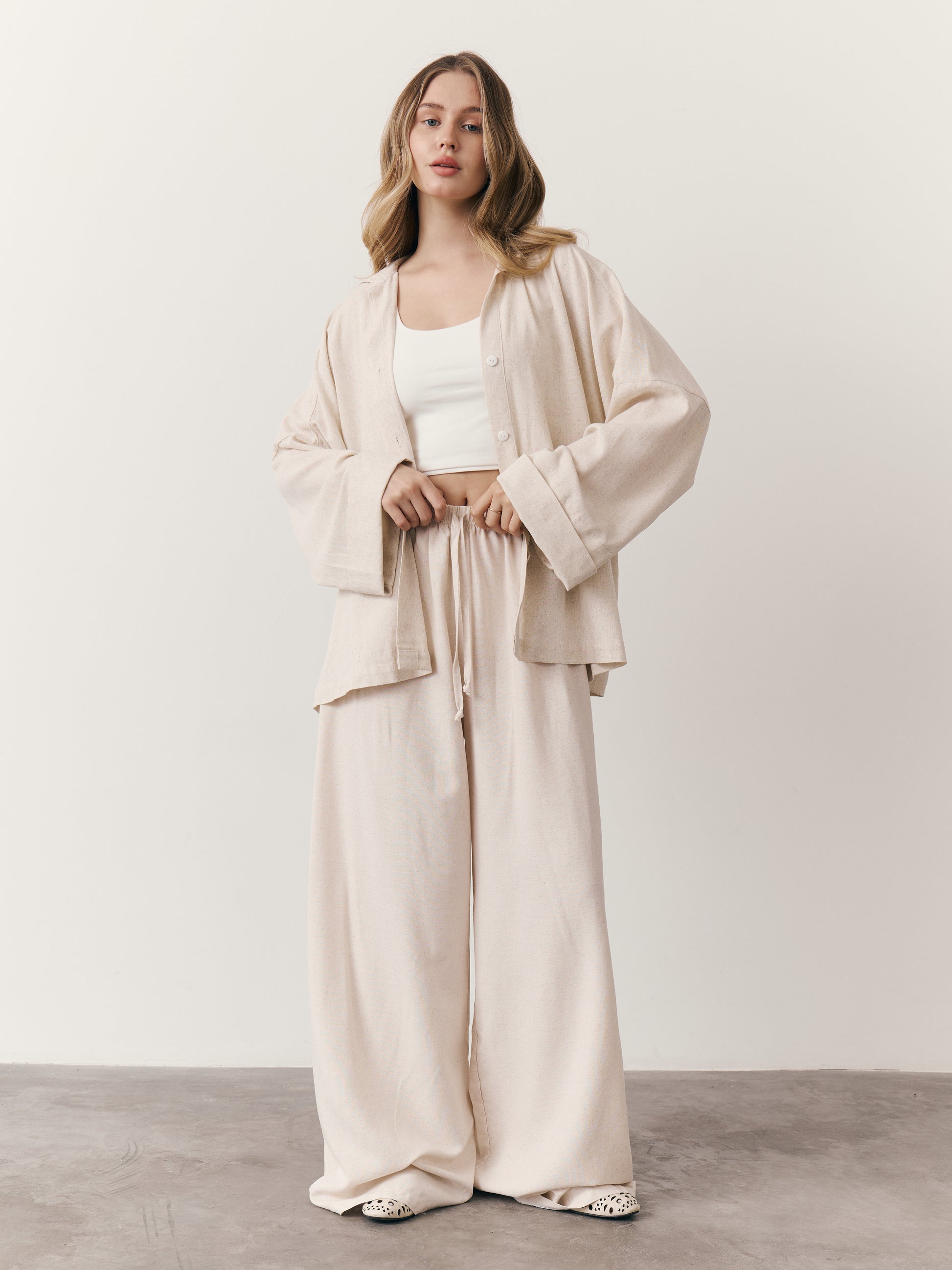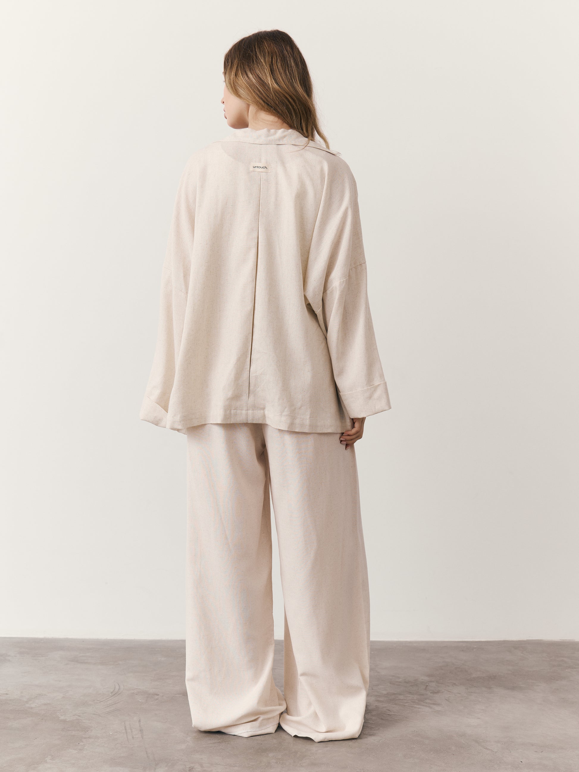 Сорочка з льону оверсайз фасону. Можна носити на завʼязках чи в стандартному вигляді. Довжину рукава можна регулювати за рахунок широкого манжету.