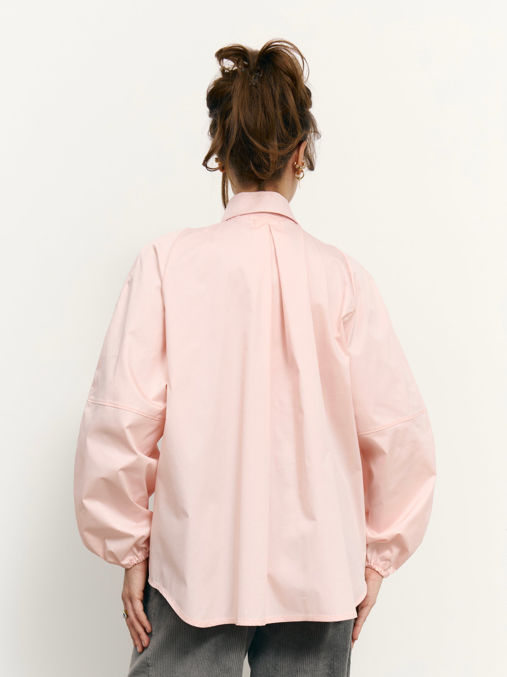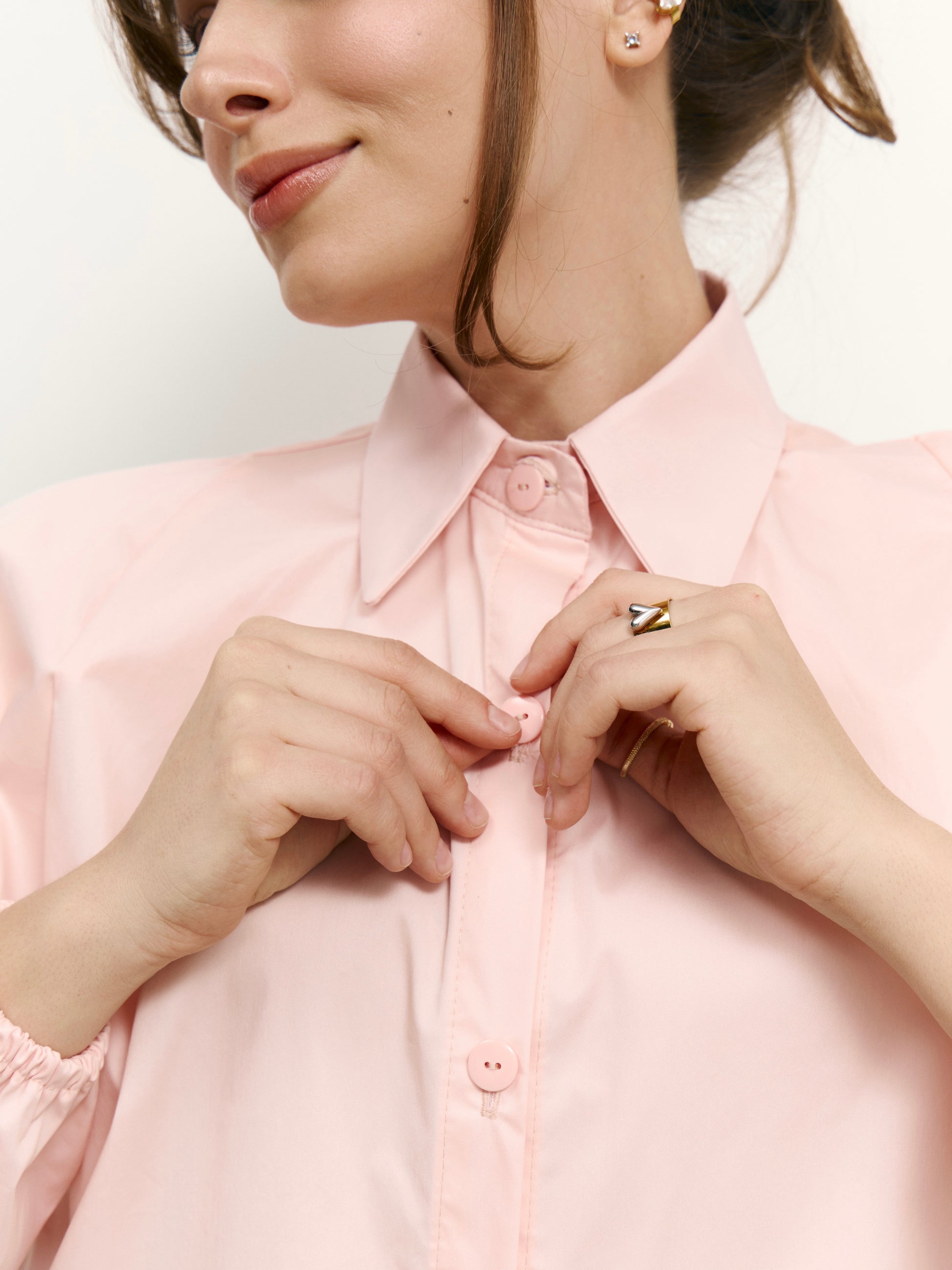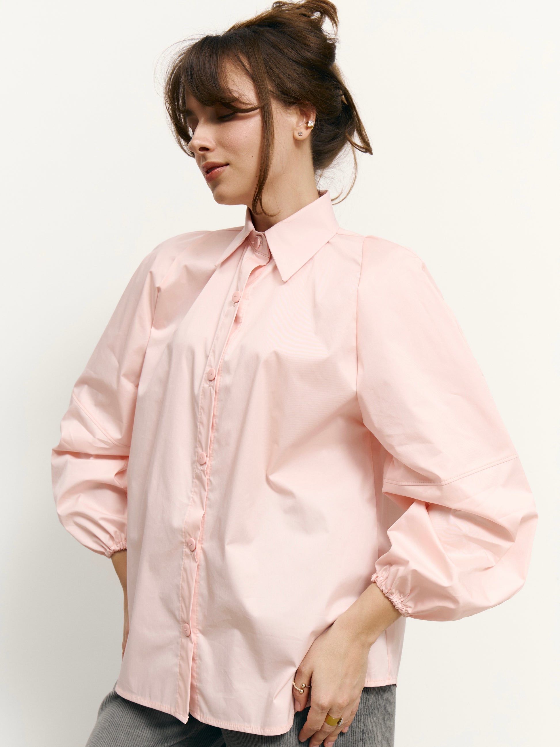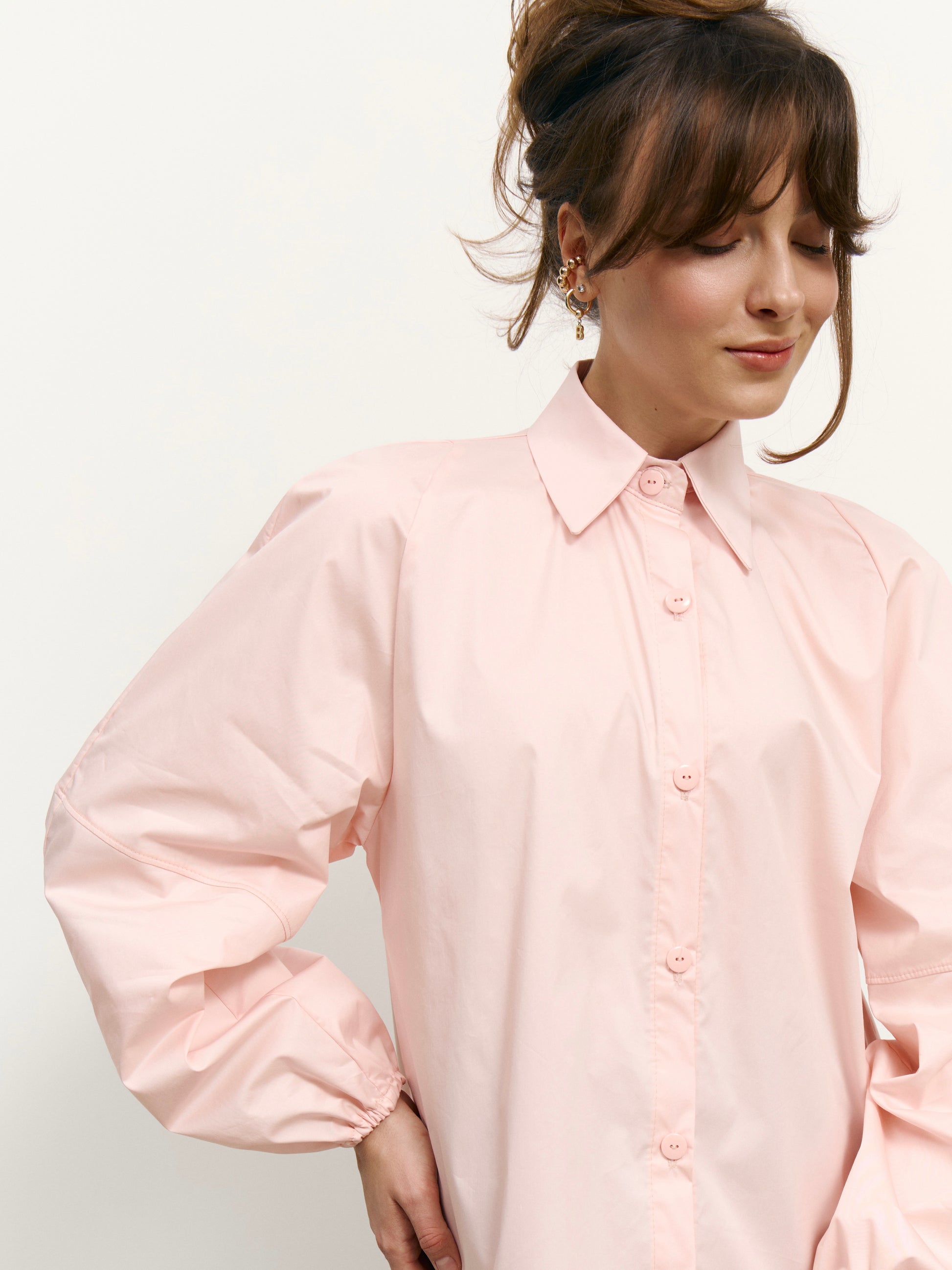 Сорочка вільного крою з м’якої бавовняної тканини в делікатну смужку. Спущене плече, об’ємні рукави з резинкою та акуратний комір