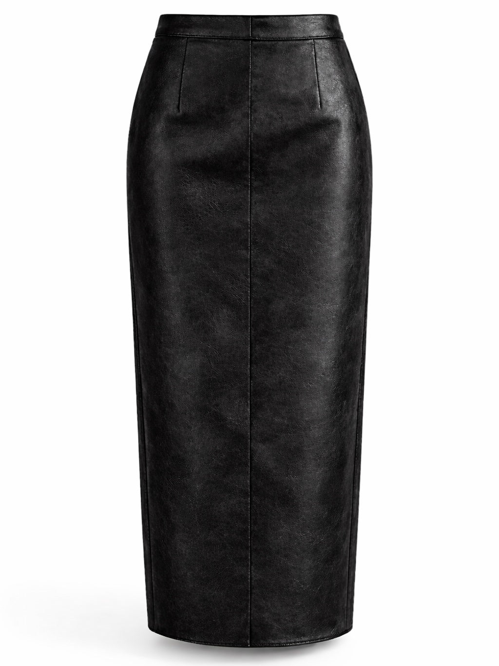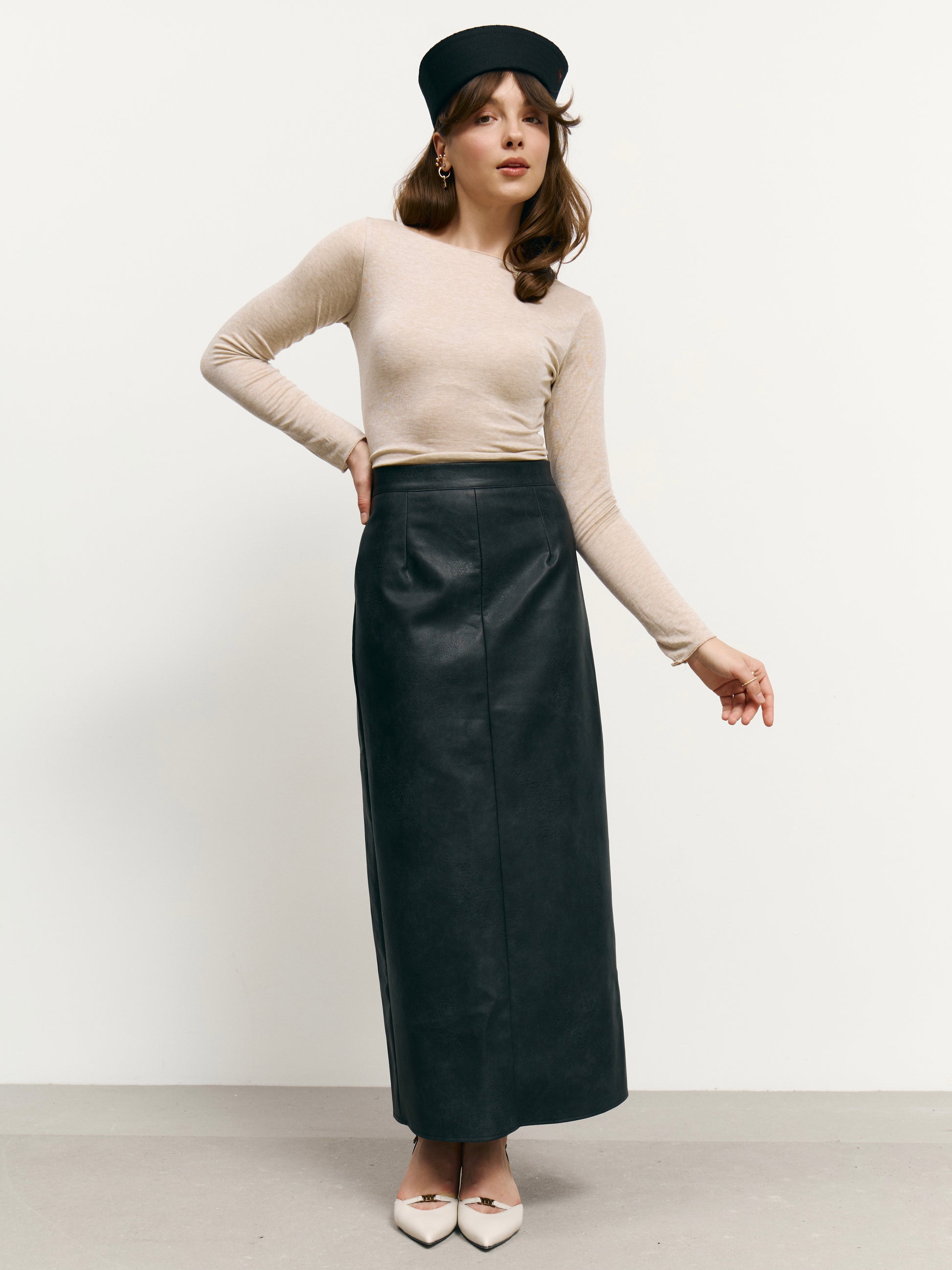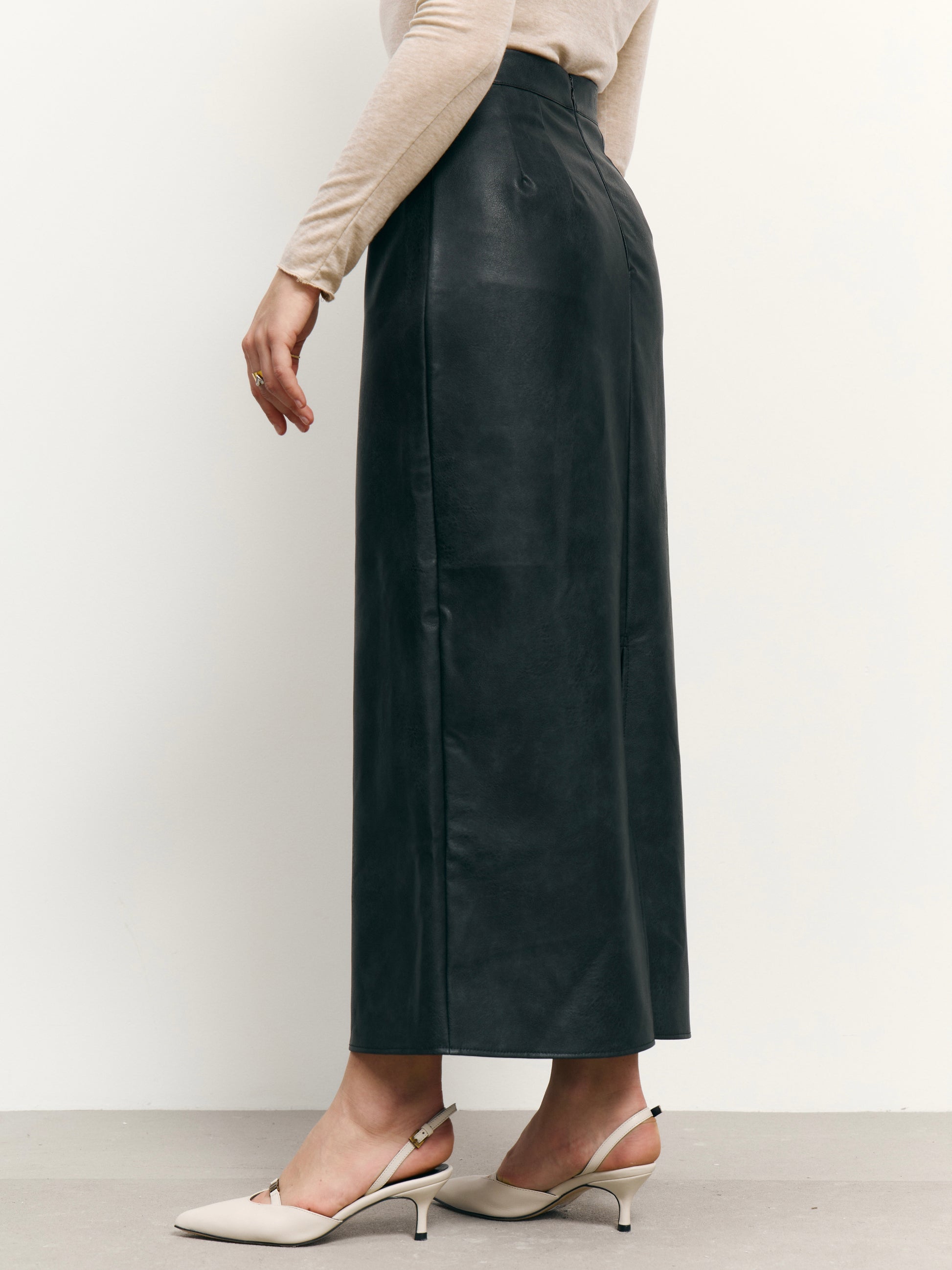 Спідниця міді з екошкіри прямого крою. Висока посадка, застібається на блискавку, має розріз ззаду для комфорту руху.