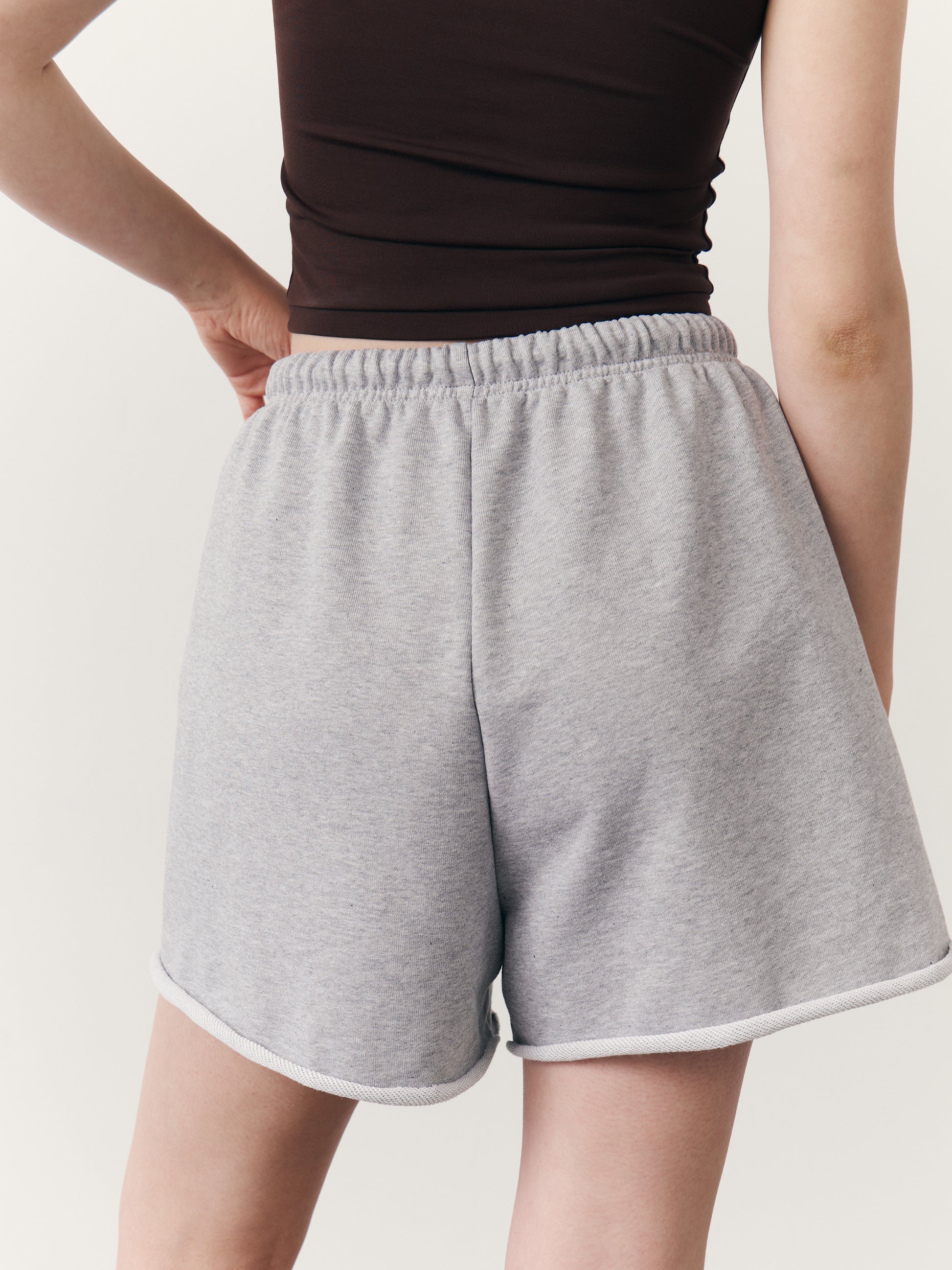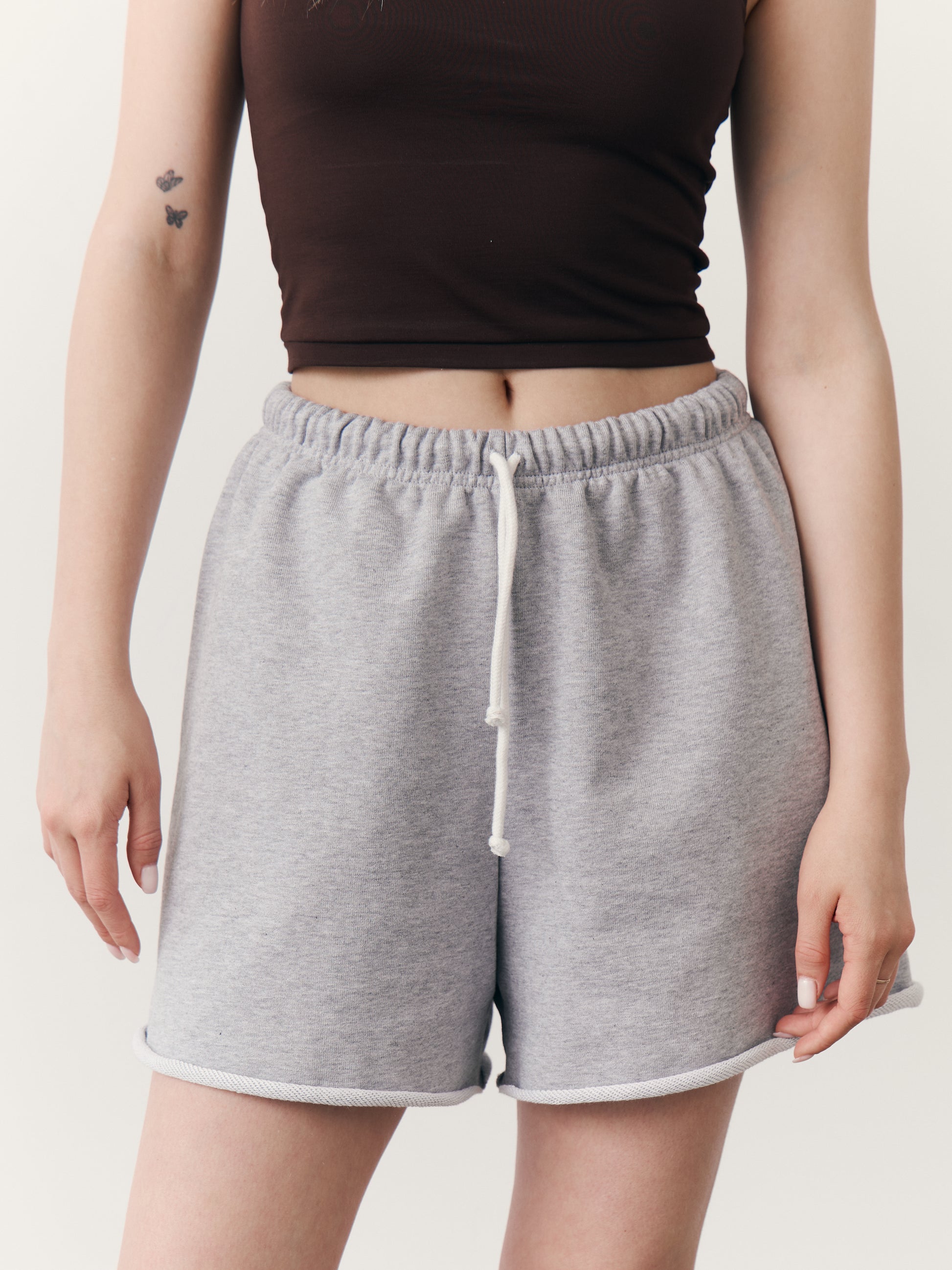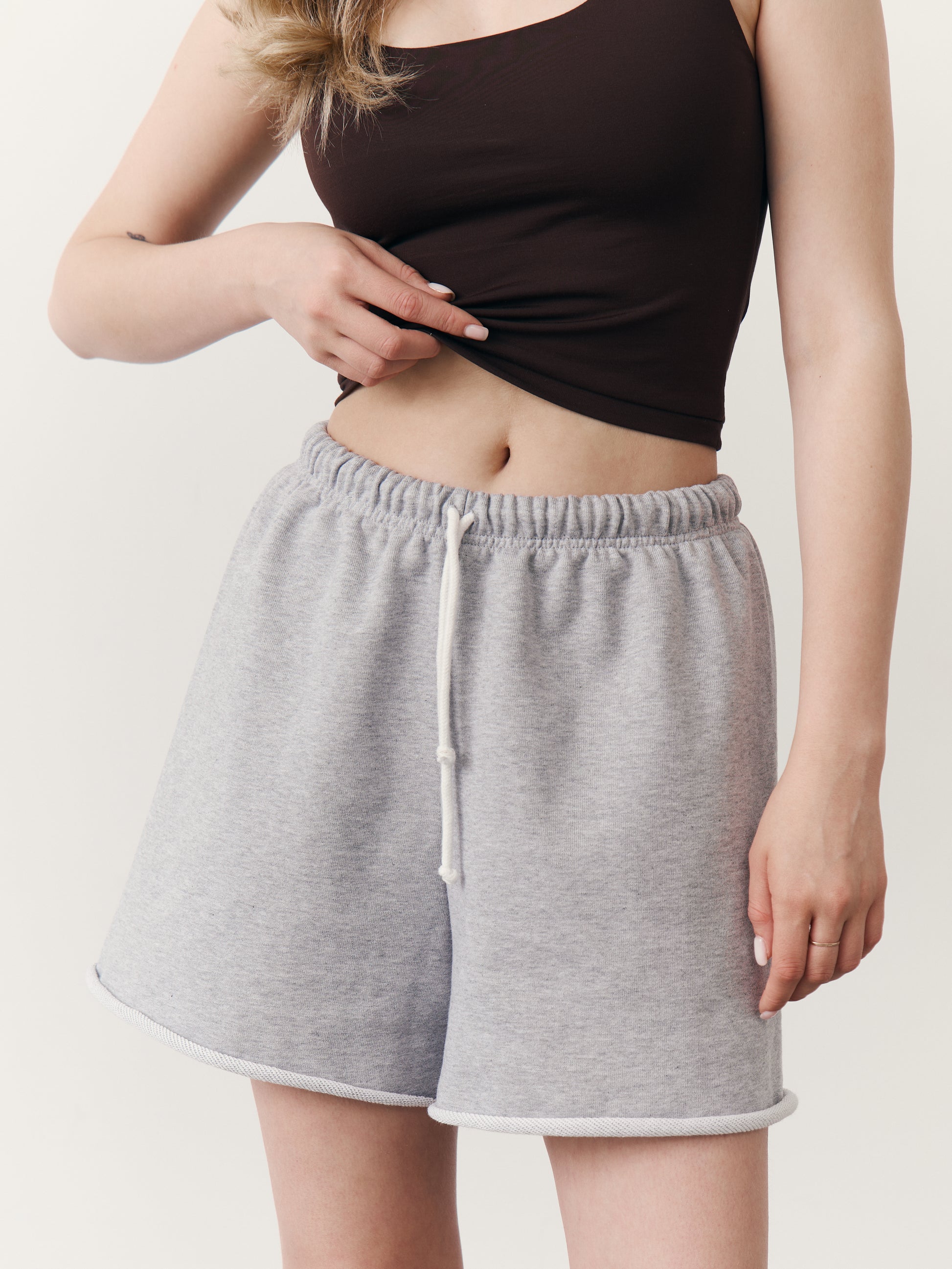 Шорти з щільного трикотажу. Пояс з мʼякої резинки та шнурка. Необроблений край штанини